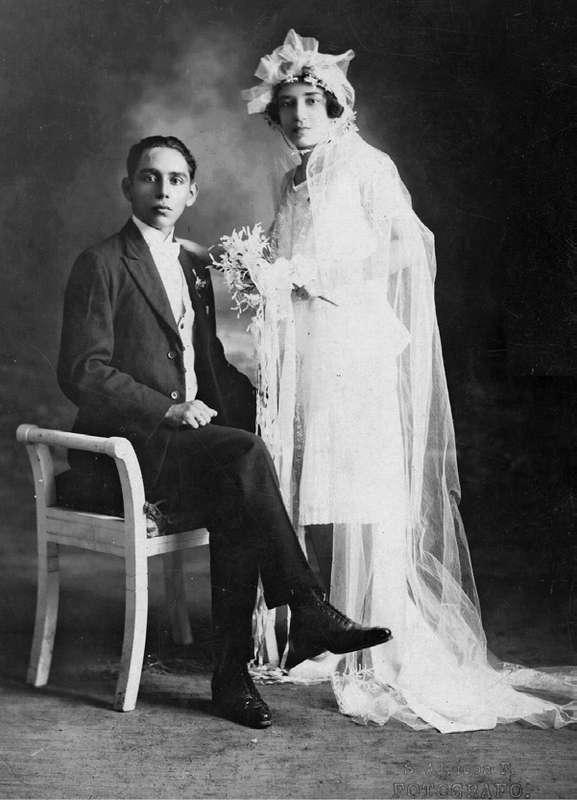 加夫列尔·埃利希奥·加西亚(1901—1984),加西亚·马尔克斯父亲;路易莎·圣蒂雅嘉·马尔克斯。于1926年6月11日,结婚当日,摄于圣玛尔塔。